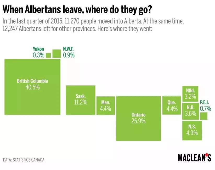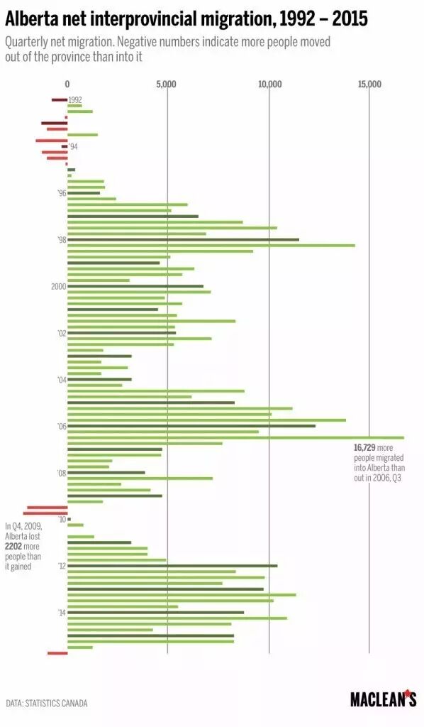 统计数据表明,几十年以来阿省一直都是创造工作岗位的大省,加拿大创造的职位,阿省占了一半以上,吸引了大量求职者来到阿尔伯塔省。多少人为了这里的高工资只身从温哥华、多伦多来工作。加拿大统计局表示,自上次阿省经济大萧条开始,人口迁出最多的一年是在全球爆发金融危机后的2009年。 人口迁出举动总是比经济衰退滞后,因为刚刚开始经济低迷时期,大量裁员还未开始,等到不得已做出裁员决定的时候,失业人员也要有所缓冲期决定去留问题,待看清形势作出决定之后还要处理自己的车子、房子等相关事宜,这一切都需要时间。