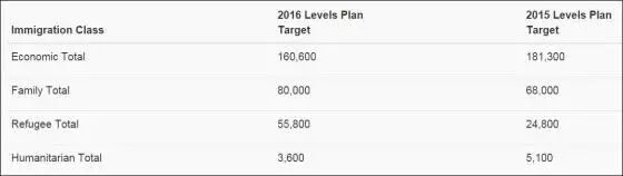 经济类移民2016年的目标则比去年大幅降低,从2015年的18万1300人降低