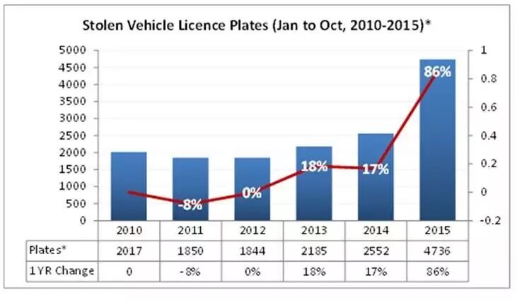 加拿大广播公司报道说,根据卡尔加里警方的报案统计数字显示,2015年全卡城发生盗窃事件10845起,与2014年同比增长45.9%,其中汽车被盗案件4,896起,比上年增长49.5%,甚至车牌被盗数量与汽车被盗案件的上升幅度一致。