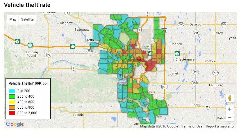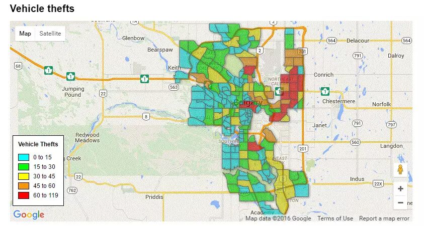 下面这张地图显示了卡尔加里各个社区的汽车盗窃率: