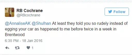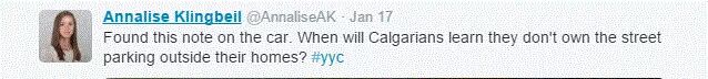她随即把这张纸条PO到她的tweet上,并且写到:“什么时候卡尔加里人才能学会你并不拥有自家门前的停车位呢?”这条消息一发马上引发了激烈的争论。转发73次,获得近100个赞还有一些激烈的对话。这场争论似乎两派各执一词,有的人支持房主,认为房主买了房子那么房屋前的停车位自然有优先使用权,而另一派则认为应该是先到先得,你空在那里我就可以随便停。