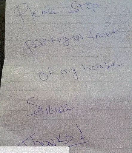 纸条上写到:“请不要把车停在我家门前,谢谢!”