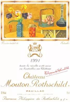 日本画家出田节子设计的1991年的酒标是我个人特别喜欢的一幅画,尽管这个年份的木桐堡在酒的风味上表现平平。画中隐喻了葡萄酒的一生:由一束盛开的花,变成成熟后被采摘的果实,而最后化为瓶中佳酿。线条简约,色彩明艳,隐隐还透露着一丝东方特色的禅意,非常耐人寻味。