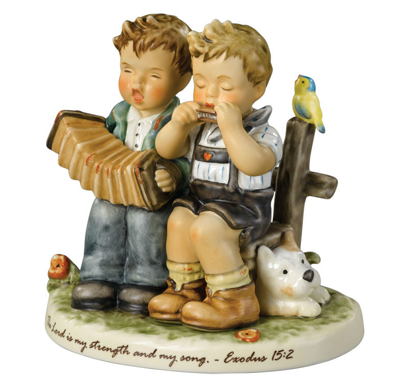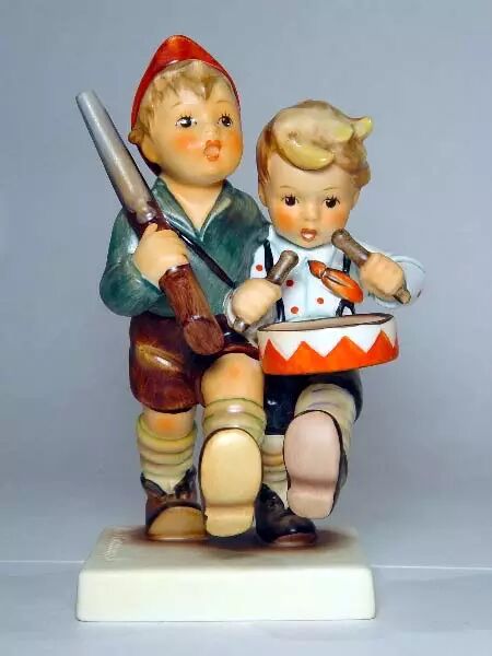 (具有讽刺意味的是:当制造商制作本尊瓷偶时,为保留可爱孩童的风格改变了原作的阴郁本貌,Hummel修女对国家主义的质疑变成了爱国主义的宣扬)
