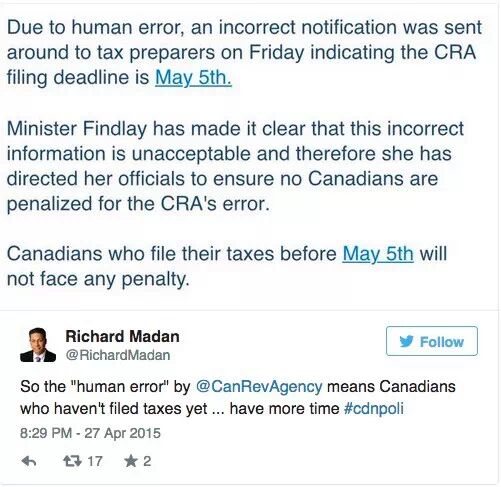 由于人为错误,CRA发出了一条错误的通知:今年报税截止日期改为5月5日,而不是4月30日。最后CRA决定5月5日之前报税的人都不会受罚。