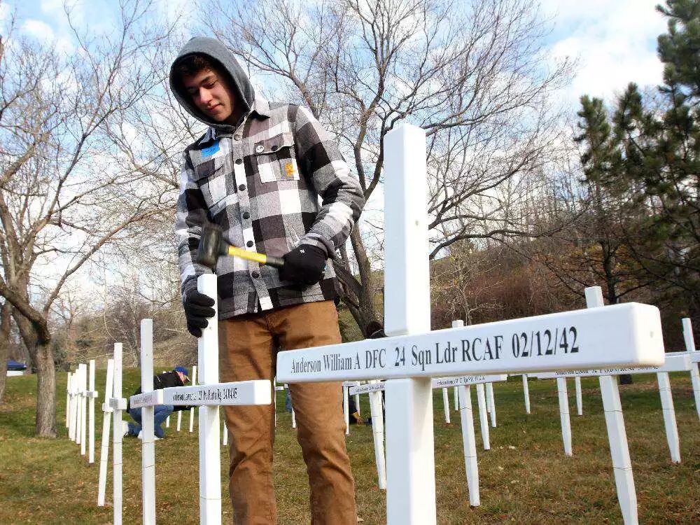 一周之前,3,200 个白色十字架已经被安放在这里,每一个十字架代表一位牺牲的Southern Alberta战士。200多名志愿者拿着锤子把这些十字架钉入地下。据估计有超过4,000位Southern Albertans为国捐躯,每年更多的人被确认,这些十字架数字在不断上升。