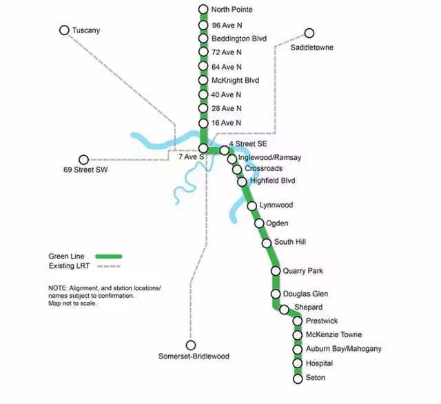 绿线LRT讨论多年,由于资金短缺和施工的难度,一直没有其实可行的计划和时间表。市长Nenshi在发布会上说,绿线轻轨(北部中线至东南)将在2017年动工,2024年竣工。由于这笔注资,最难的穿越Bow River的工程方案-无论是架桥还是隧道-将会尽快作出决定。