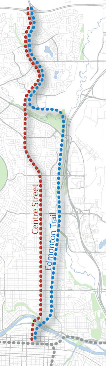 采纳了多数人的反馈,卡城公交管理局(Calgary Transit)选择了中央街作为通往北部的绿线城铁线路。以前曾考虑过Edmonton Trail。北线城铁将延伸至胖妈山(Panorama Hill)。