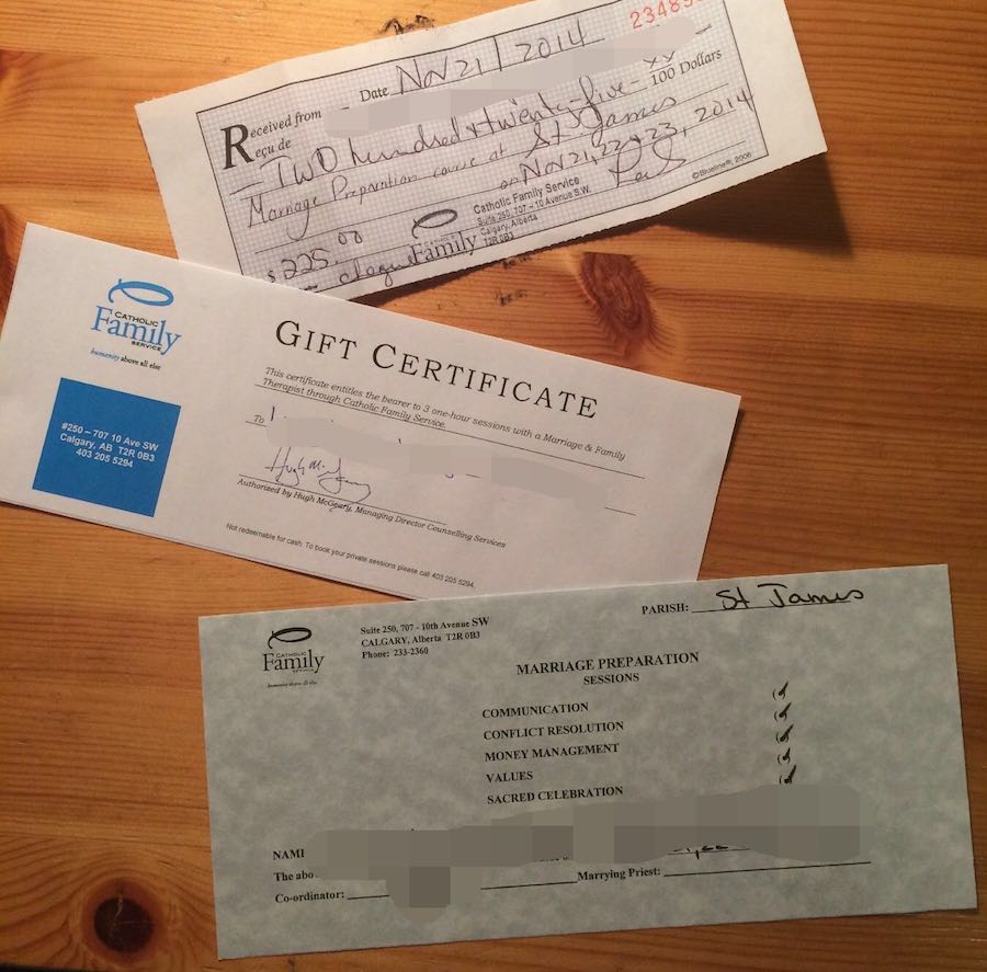 该步骤为可选步骤,如若新人有宗教信仰,需接受为期两天的婚礼课程,各个宗教要求不一。婚礼课程花费大概200加币。课程结束后会发放课程证明,届时交给牧师即可。