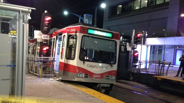 约9pm,C-train在City Hall(竟然在同一个站!)站台出轨,撞倒了站台上的灯柱,毁了信号灯。