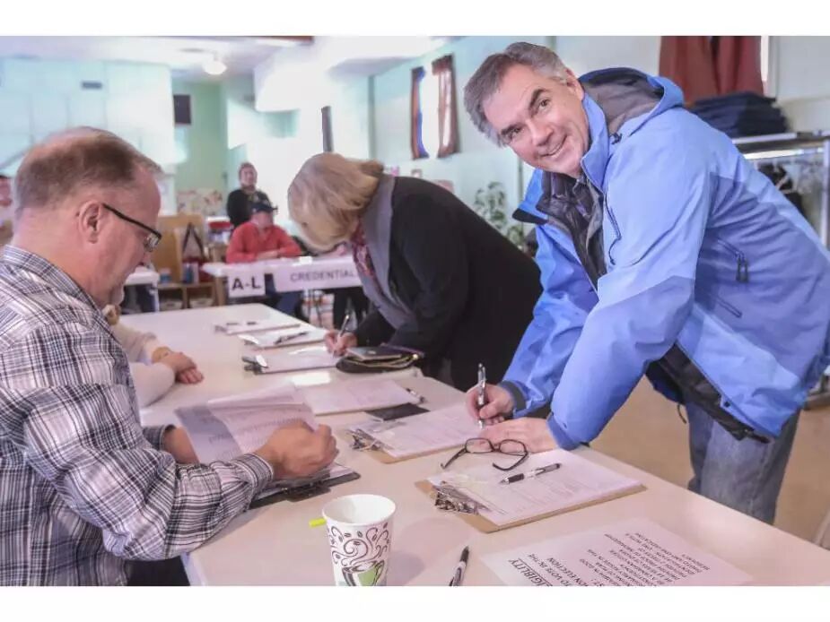 2月21日,省长Prentice和夫人在自己的选区,卡城Mountain View的Renfrew United Church,注册登记写下自己的选票。