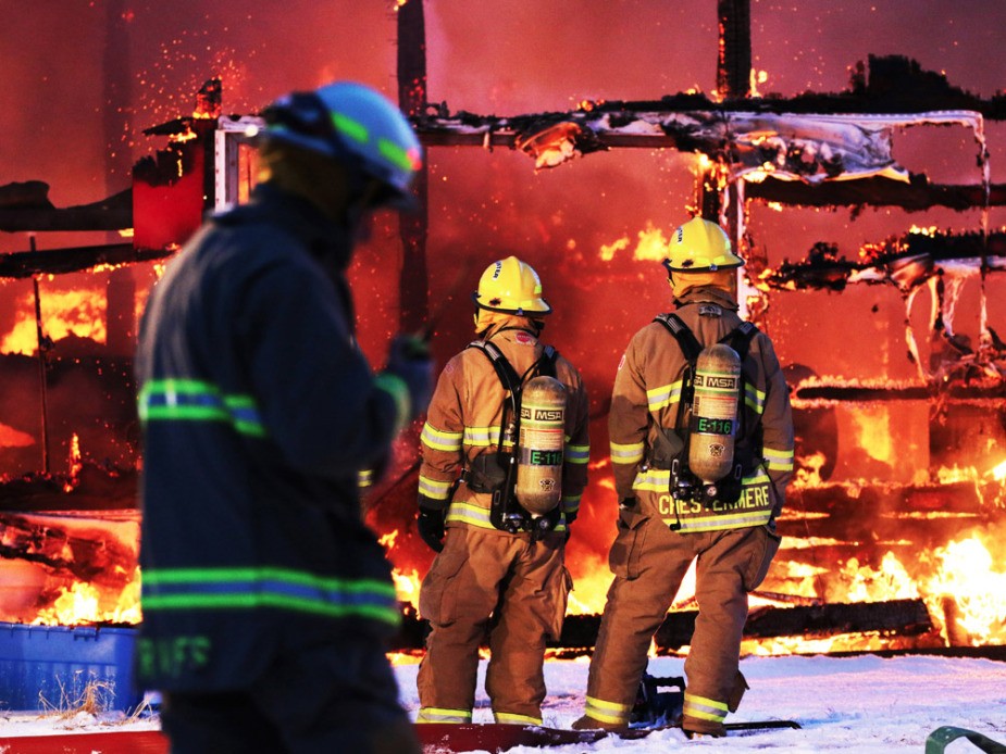2月27日,昨晚大火,从Calgary,Airdrie和Chestermere赶来的消防员正在扑救卡城西北部的一个谷仓。