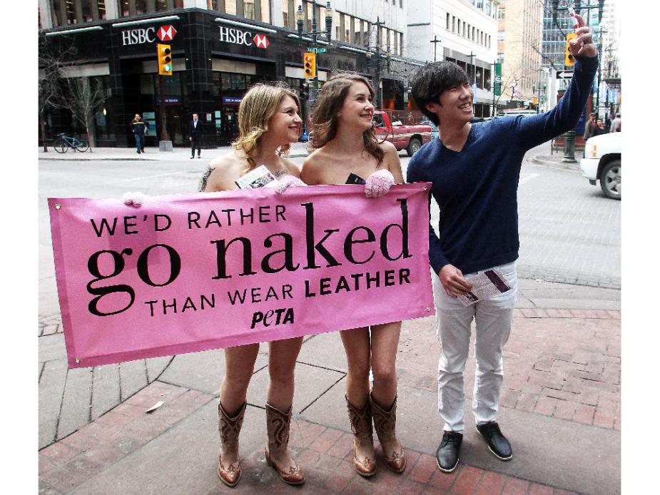 2月24日,周二,几乎全裸的善待动物组织成员Emily Lavender和Amy Balcome在街头抗议。她们只穿着仿皮的牛仔靴和很少的一点衣服,在Stephen Avenue分发小册子,呼吁人们不要使用皮毛制品。