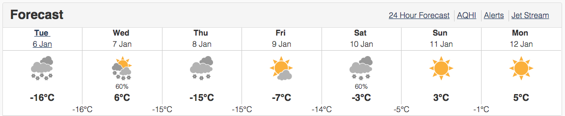 坏消息是天气预报周日气温才能回升至3C,今天最低温度达到风冷-29C。