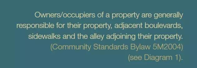 通常屋主或者租客需为毗邻该物业的街道或人行道、小巷等区域负责任。参见(Community Standards Bylaw 5M2004)