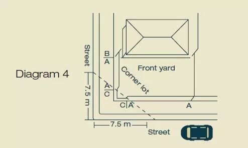 - 在坐落于两条街道交汇区域的街角物业,据街角连接的两个方向7.5米(25英尺)的范围里,栽种的任何植物高度不得超过0.75米(2.6英尺)(见图四 和Calgary Traffic Bylaw 26M96)。