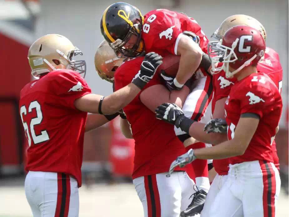 Alberta高龄全明星赛,来自Olds的球员Slotback Duane Neustaeter在达阵后受到队友的祝贺,这次比赛在南北部全明星之间举行,南部36-15赢得了比赛。