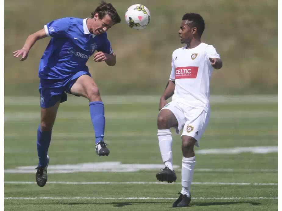 5月17日,Foothill 足球俱乐部球员Mitchell Bauche(右)正在防守Puget Sound Gunner 队员的头球,Foothill 足球俱乐23岁以下年龄组以2-0赢得了比赛