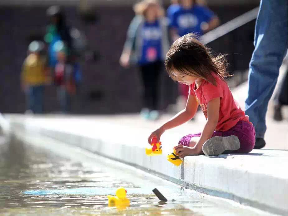 5月20日,Calgary International Children’s Festival,5岁的Alyssa Osachuk在玩喷泉里的小黄鸭,这些小黄鸭在儿童节开幕日被放到了喷泉池里。
