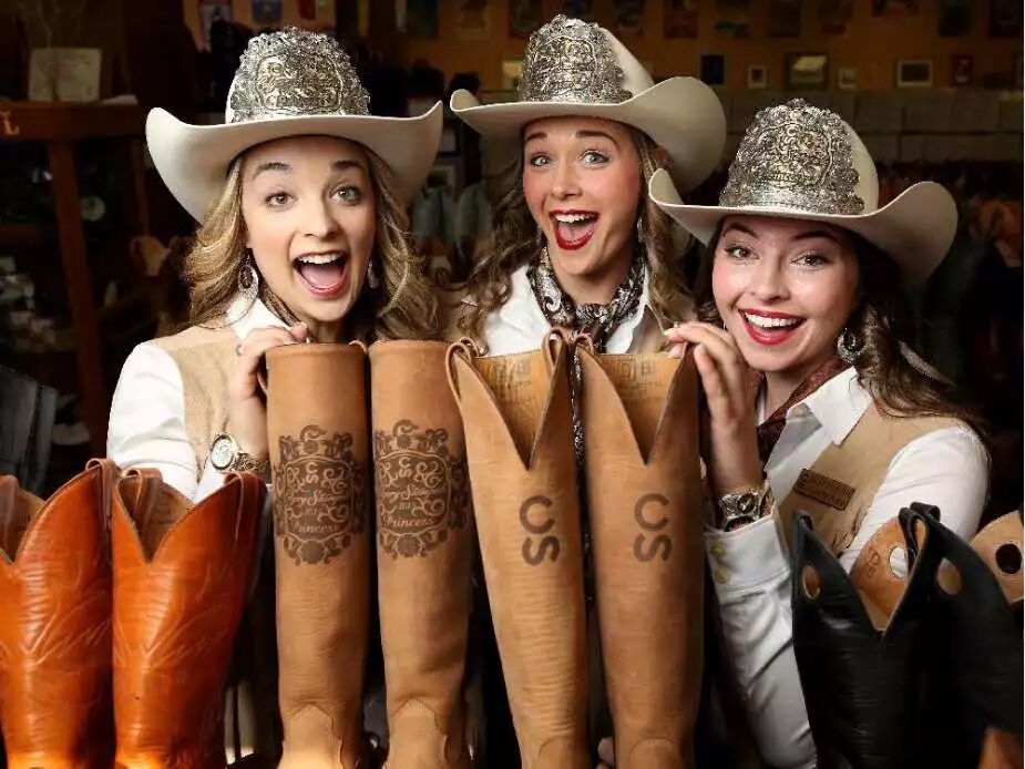 5月20日,牛仔节皇后和公主在Alberta Boots Company领到了新的牛仔靴。从左至右:Princess Kimberly Stewart, Queen Mick Plemel and Princess Haley Peckham