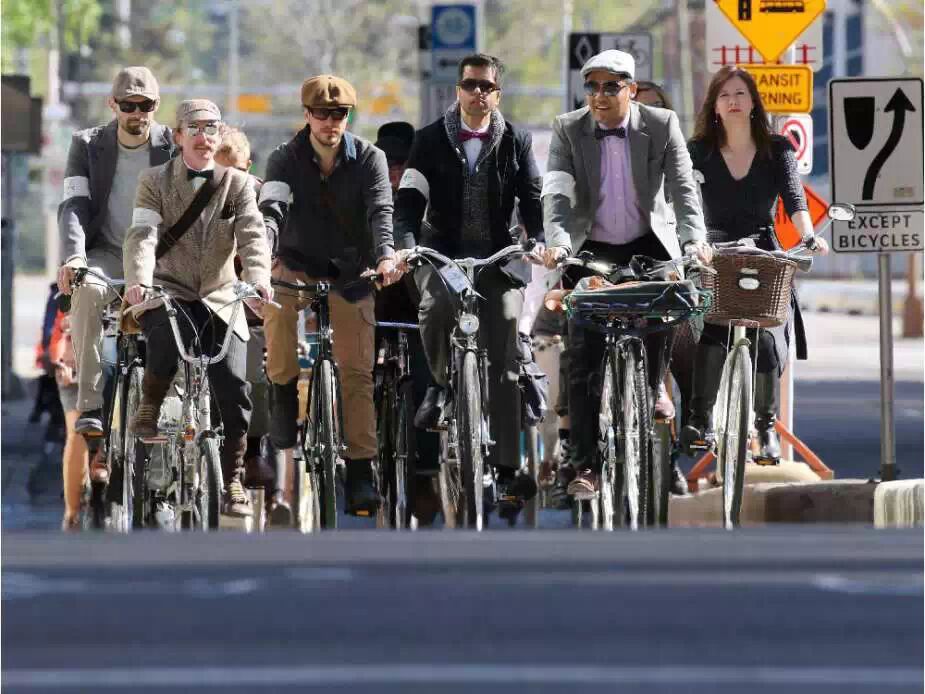 5月15日,卡城年度花格呢子自行车骑行(Calgary’s annual Tweed Ride)在市中心7th Street的自行车道骑行。