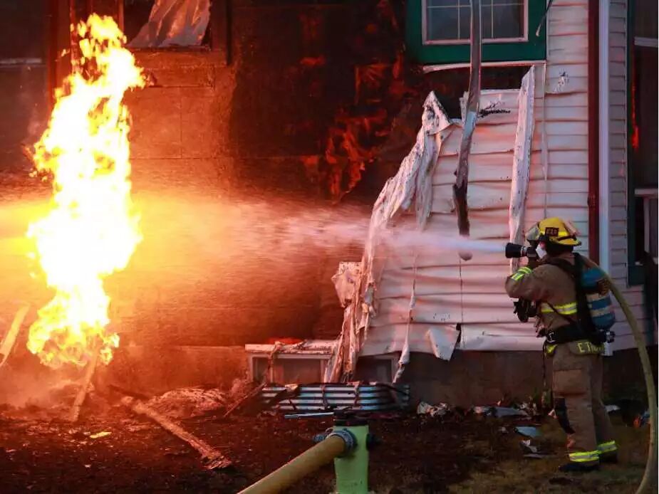 上周三晚卡尔加里消防队员正在用水扑灭Erinwoods一户人家因天然气管线引发的大火