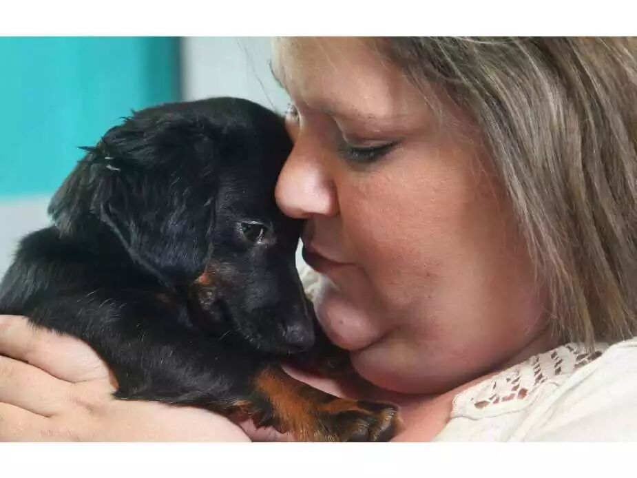 乔迪格雷夫斯,卡尔加里城市项目的客户,抱着她的腊肠犬Izzy。Izzy接受到了卡尔加里大学兽医专业学生参与的为低保家庭的提供的社区宠物体检社区服务计划。