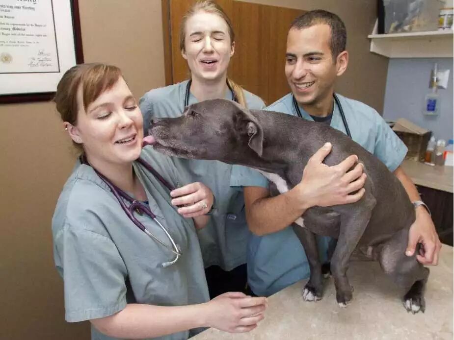 卡尔加里兽医专业的学生Jen Wheeler 正被一只叫做Edger的斗牛犬亲切的亲吻着,站在旁边的是他的同事Amy Larkin和她的教授Serge Chalhoub博士。这些学生正在参与社区服务计划项目,此项目意在为一些卡尔加里低收入家庭提供宠物检查及预防措施。