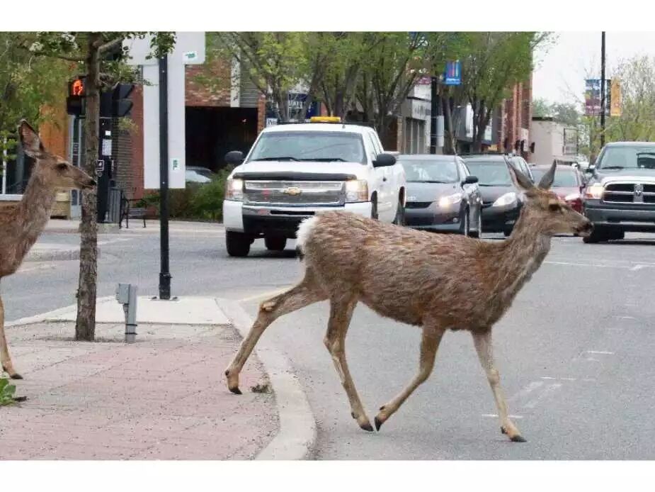 5月28日,Okotoks繁忙的McRae Street,几只鹿穿过街道,小镇居民的生活越来越被鹿群所干扰
