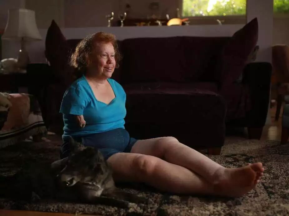 图片中是卡尔加里沙利度胺(一种镇静剂,可引发新生儿畸形)幸存者玛丽·奥尔尼与她的狗伦诺克斯。联邦政府已经宣布了对加拿大的沙利度胺幸存者的补偿方案,
