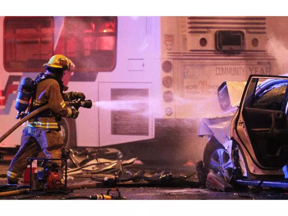 3月22日,在Willow Park Drive/Macleod Trail SW路口,一辆SUV和公交相撞引发大火,消防员在全力扑救。