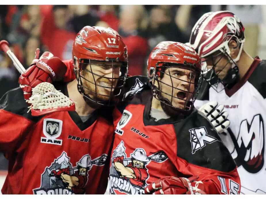 在Saddledome进行的和科罗拉多猛犸队的全国曲棍网兜球联赛中破门得分后,卡城队员Curtis Dickson和Shawn Evans怒吼庆祝。