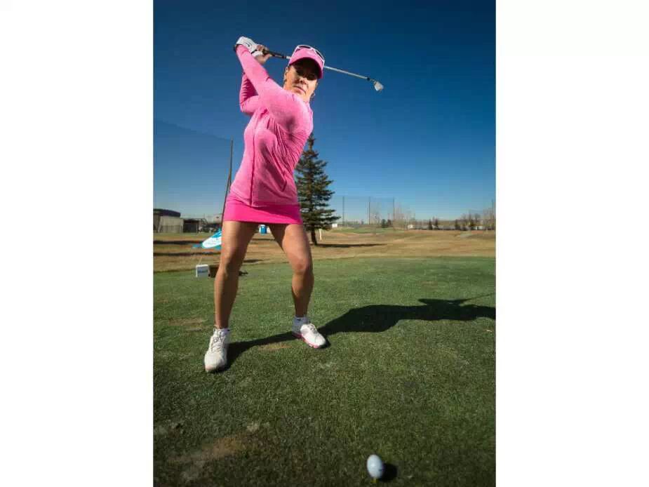 参加由Shaw公司举办的慈善高尔夫比赛的一位女选手正准备奋力挥杆。