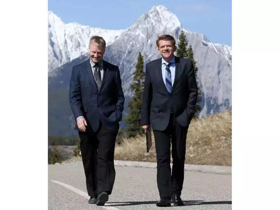 野玫瑰党党魁BrianJean和Banff地区的候选人ScottWagner谈笑风生的散步,一起谋划竞选事宜。