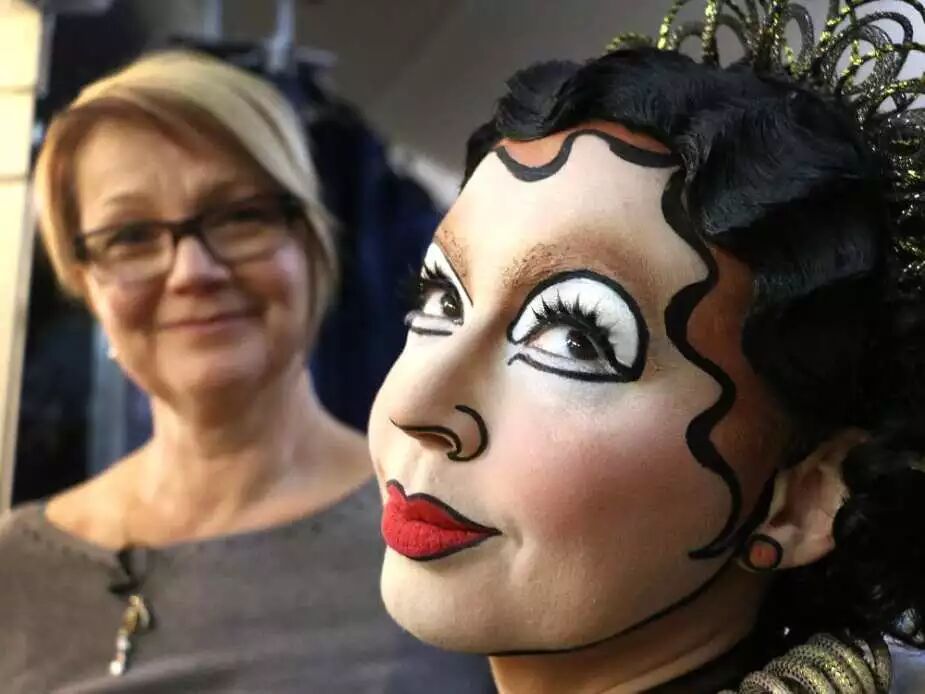 4月23日扮演Klara的太阳马戏团剧组成员Ekaterina Pirogovskaya在后台炫耀她与化妆设计师Eleni Uranis(图左) 的杰作。为了确保每位成员最后妆容与最初设计相符,Urains在卡尔加里检查每一位剧组成员的化妆