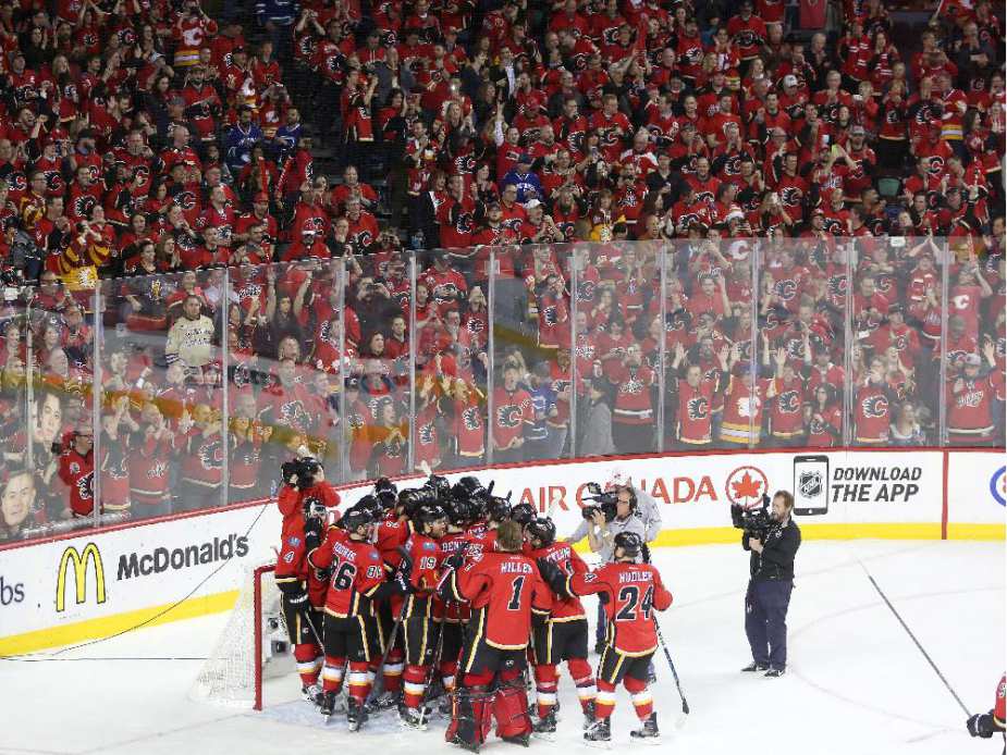 卡尔加里火焰队在Saddledome庆祝与温哥华 Canucks 进行第六场NHL季后赛获得胜利