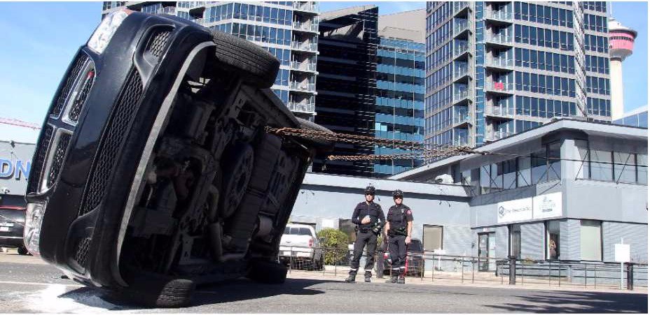 4月27日星期一早上两位警察看着一辆由于车祸侧翻的SUV被拉回来。由于2辆车在12Ave在t型路口发生车祸造成了周一早上Macloed trail的交通堵塞。警察表示出事司机只是受了轻伤