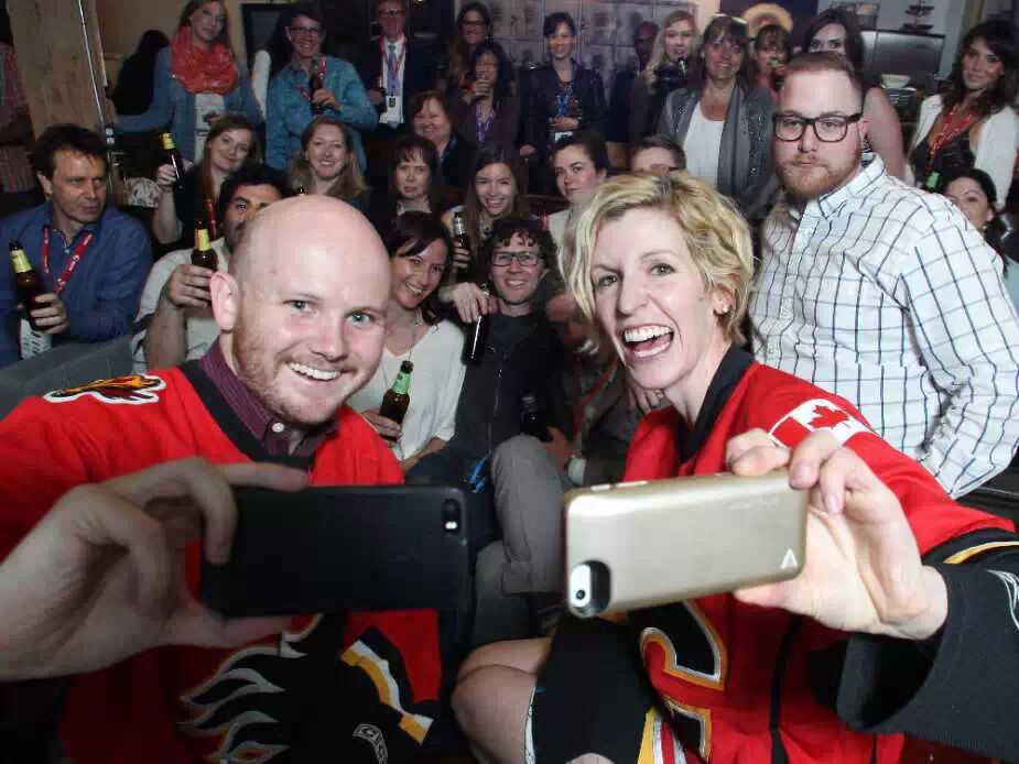 4月28日在换上火焰队队服后,卡尔加里著名的社交媒体专家Mike Morrison 和kelly Doody,在星期二社交媒体峰会上自拍。 他们举办了一场关于如何让年轻朋友学习社交艺术与技能并且成为社交达人的讨论会。