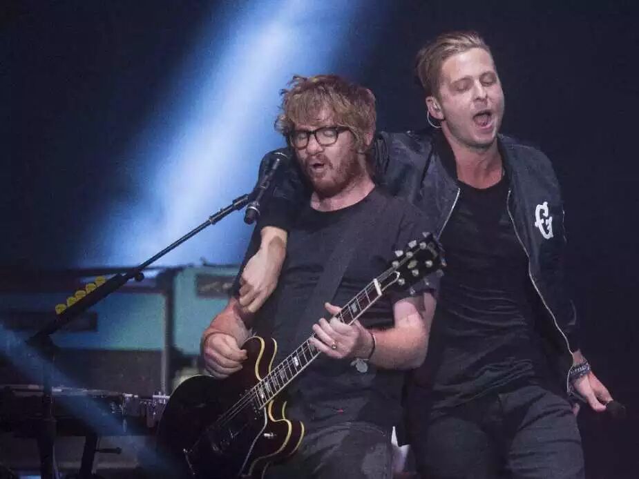 4月30日著名乐队One republic在卡尔加里saddledome举行的演唱会上主唱Ryan Tedder与Zack Fikins