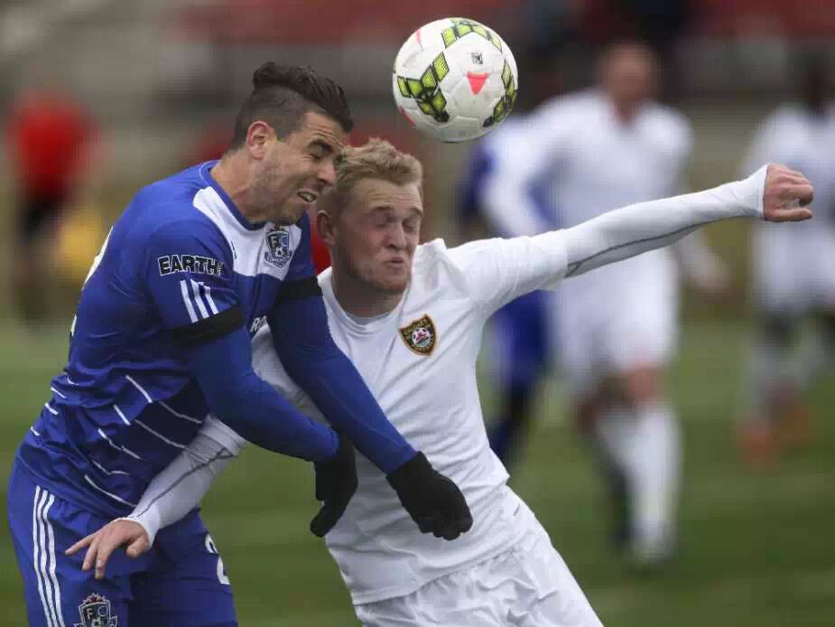 4月25日,在卡尔加里Shouldice 公园的Stampeder 球场进行的一场足球赛上,Foothill 选手Kieren Hay ( 图中) 与对手相撞。Foothills 足球俱乐部在与埃德蒙顿足球俱乐部举行的一场表演赛上以3比1落败