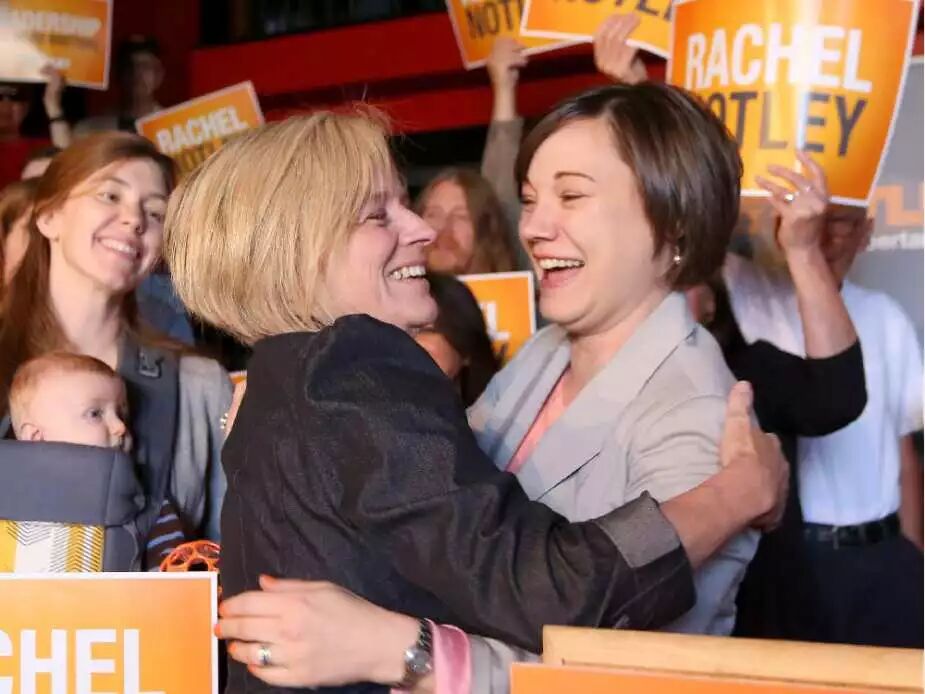 4月30日, 在Lethbridge,新民党主席Rachel Notley ( 图左), 和Shannon Phillips 在对她们的支持者进行演讲前亲切拥抱