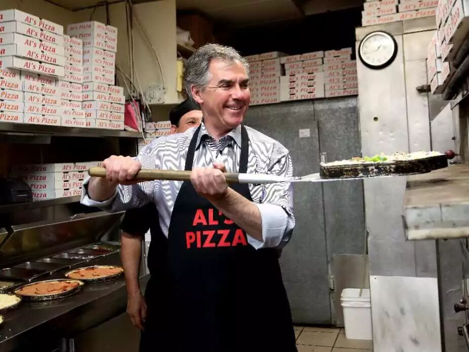 年4月29日,省长Jim Prentice 在卡尔加里的Al’s Pizza 烤披萨