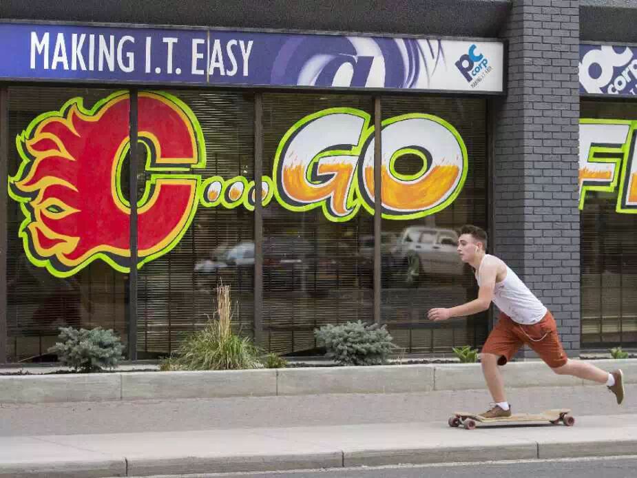 2015年4月29日,Garry Peck 在市中心8街玩滑板,后面的窗户上的涂鸦是火焰队队标后加上 “Go Flames!”