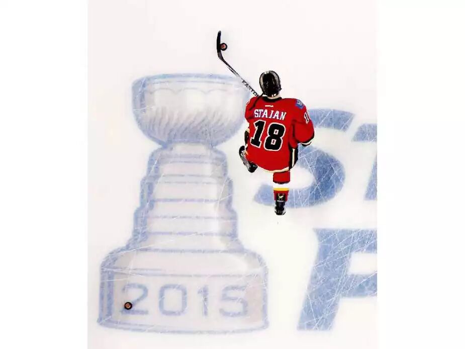 卡尔加里火焰队队员Matt Stajan在与温哥华 Canucks 进行第六场NHL季后赛之前在卡尔加里的Scotiabank Saddledome体育馆进行场地热身