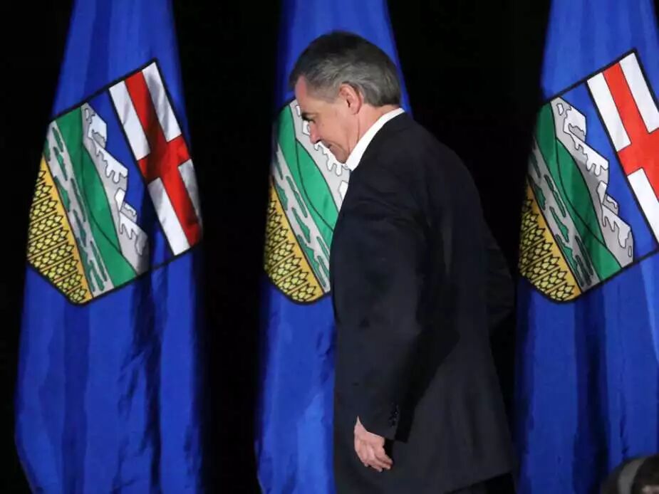 2015年5月5日星期二,保守党领袖Jim Prentice发表辞去省议员及省长职务后缓缓离开他在卡尔加里竞选总部的演说台。在年省议会大选中,连续任职长达四十年之久的保守党的势力大幅缩减。