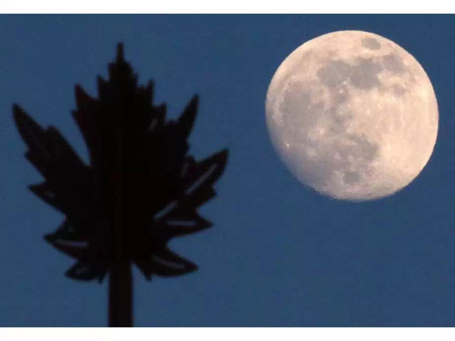 2015年5月2日星期六,被16 Avenue 路边街灯照亮的一片枫叶和一轮明月被定格到一副画面中