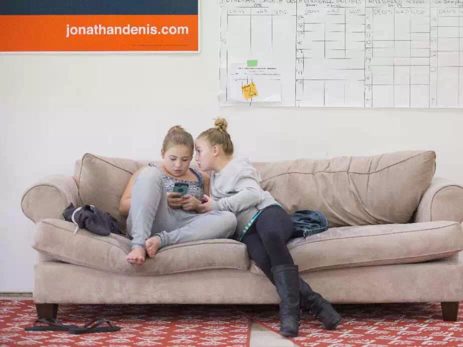 2015年5月5日星期二,在PC党候选人Jonathan Denis的卡尔加里竞选总部,两位小姑娘在大选结果发表的前几个小时前带在安静的屋子里,时而神色凝重的玩弄手机,时而低头窃窃私语
