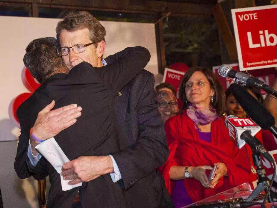 2015年5月5日,在自由党竞选总部,David Swann拥抱省议员David Khan