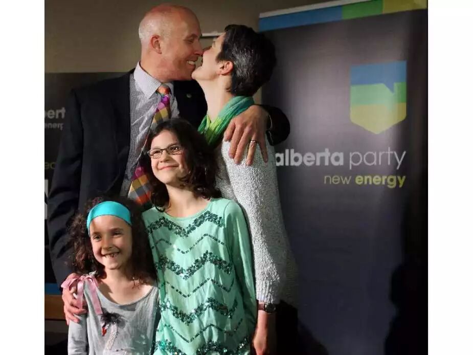 2015年5月5日竞选日庆祝会上,Greg Clark和他的妻子Jessica Simon及8岁女儿Miranda,11岁女儿Laura庆祝为Alberta Party政党赢得Calgary Elbow选区的胜利