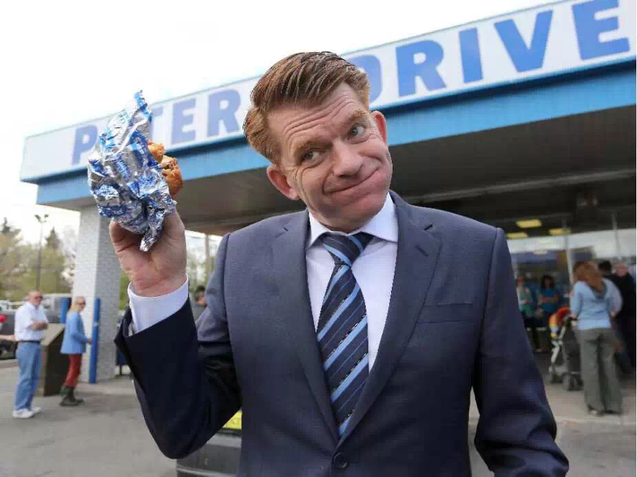 2015年5月1日,野玫瑰党领袖Brian Jean在卡尔加里著名的汉堡店Peters买汉堡和奶昔